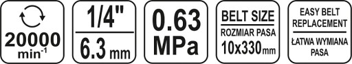 Profesjonalna taśmowa szlifierka pneumatyczna. Rozmiar taśmy 10x330 mm, prędkość robocza 20 000 obr/min. Przyłącze powietrza 1/4". Głowica robocza regulowana.