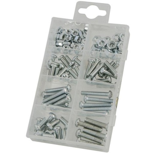 Zestaw zawiera szeroki asortyment śrubek krzyżakowych z łbem walcowym, nakrętek i wkrętów uniwersalnych w wygodnym przezroczystym organizerze.