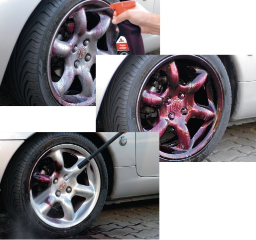 Rozpryskać środek na zimne i suche felgi. Indykator koloru wskazuje proces działania środka: zmienia swój kolor z niebieskiego na fioletowy w momencie rozpuszczenia zapieczonego pyłu hamulcowego. Po zmianie koloru na ciemnofioletowy można mieć pewność, że felga została wyczyszczona. Spłukać felgę myjką ciśnieniową i wysuszyć.