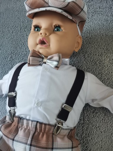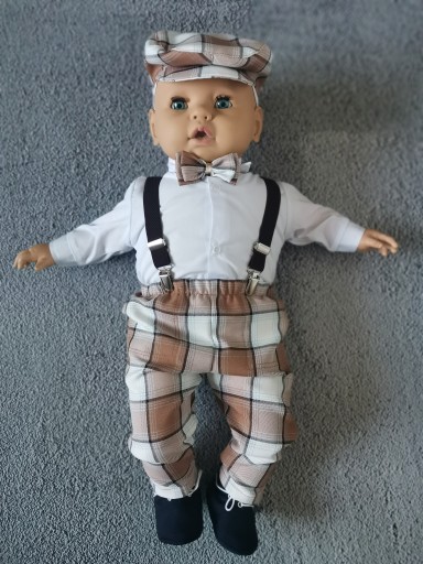 Niesamowity 6 - częściowy komplet do chrztu dla chłopca wykonany z miękkiego materiału w modnym beżowym kolorze!!! Wzór w kratę nadaje charakteru całej stylizacji
