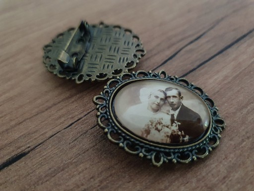 Szklana broszka do bukietu Ślubnego z przesłanym przez Ciebie zdjęciami, grafiką, tekstem.