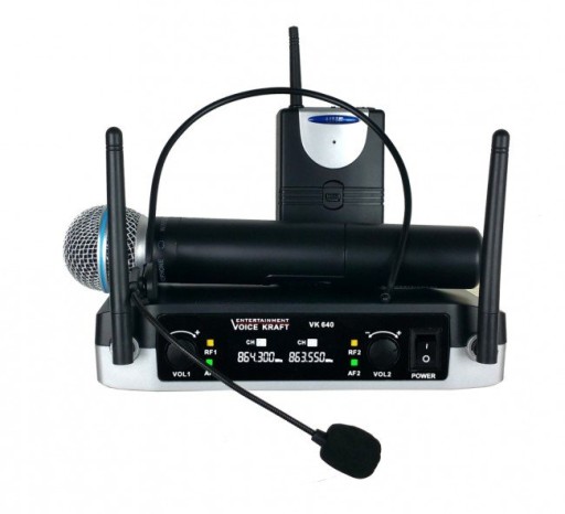 W zestawie również dodajemy dwa mikrofony (do ręki + nagłowny) bezprzewodowe ze stacją odbiorczą.