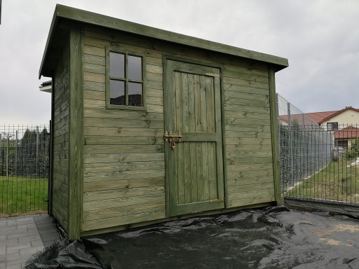 Produkt wykonany z naturalnego drewna sosnowego nieimpregnowanego. Przed użytkowaniem należy zabezpieczyć domek narzędziowy środkiem do ochrony drewna (np.impregnat, olej, lauzra).