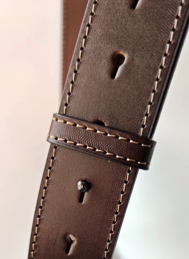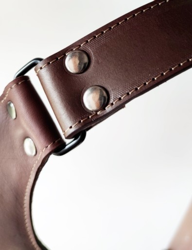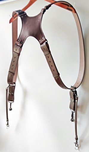Szelki w kolorze ciemny brąz (czekoladowe), wykonane ze skóry naturalnej najwyższej jakości z dbałością o najdrobniejszy detal. Szelki jak i wszystkie dodatki skórzane, są dodatkowo przeszyte nicią w kolorze beżowym (na żywo wyglądają obłędnie). Krzyżak na plecy dodatkowo od strony wewnętrznej jest podszyty miękką skórą perforowaną. Szelki posiadają bardzo dużą skalę regulacji, także po odpowiednim ustawieniu będą pasować na każdego. Aparat mocowany jest do szelek poprzez uniwersalną śrubę fotograficzną 1/4'' osadzoną na mocnym, metalowym karabińczyku z krętlikiem. Paski asekuracyjne po obu stronach zakończone są także karabińczykami metalowymi w celu sprawnego odpięcia sprzętu. Wykonane są także ze skóry naturalnej co gwarantuje bardzo dobrą ochronę sprzętu jak i dopełnienie wizerunku estetycznego szelek. Całość zamocowana jest na szelkach z wykorzystaniem ramki rymarskiej o grubości 3 mm i paska wykonanego z tej samej skóry z której zostały wykonane szekli. Szerokość szelek - 4 cm a grubość skóry - 3-4 mm. Szelki wykonujemy samodzielnie w małym zakładzie kaletniczym dlatego czas oczekiwania to ok 3 dni roboczych.