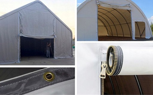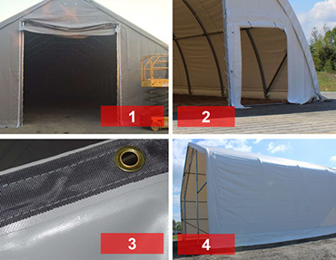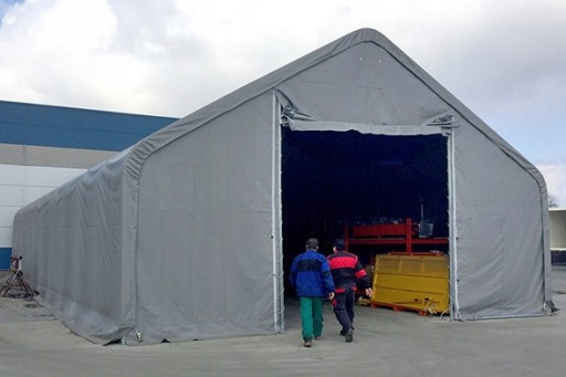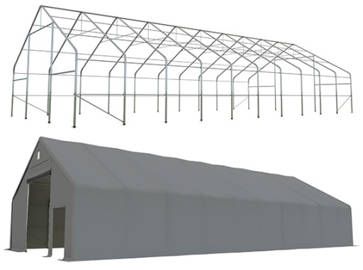 Konstrukcja, plandeka, ściana szczytowa z dużą bramą i wejściem dla ludzi.