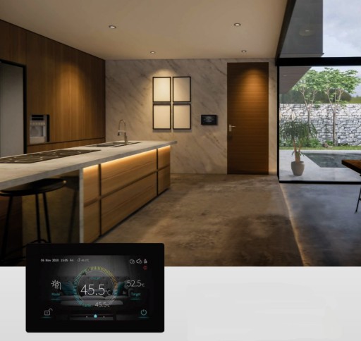 Wysokiej klasy sterownik z 5-calowym kolorowym ekranem dotykowym umożliwia szybki wgląd w parametry pracy pompy, takie jak temperatura oraz zużycie energii.