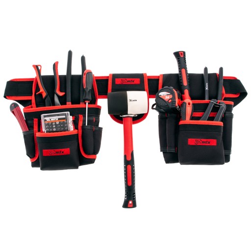 pas narzędziowy|przesuwna sakwa x2 (w każdej kieszeń x3)|uchwyt na młotek|uchwyt na taśmę mierniczą