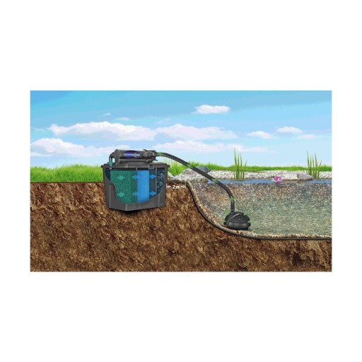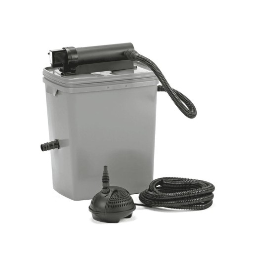 Filtry przepływowe montowane są ponad lustrem wody przy brzegu stawu lub ponad strumieniem, aby woda spływała z powrotem do stawu grawitacyjnie. Zestaw Pontec MultiClear 5000 set wyposażony jest w lampę UVC o mocy 7W, efektywnie usuwającą glony, będące przyczyną zielonej wody.