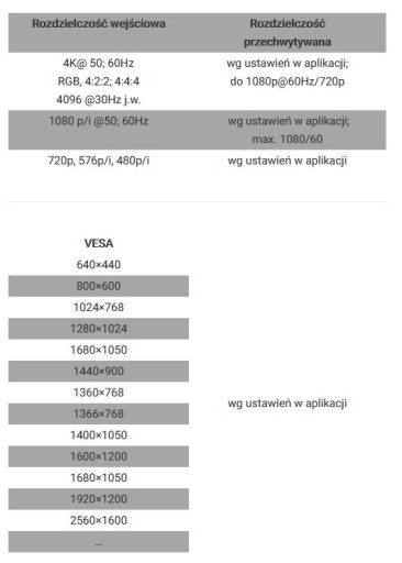 Obsługiwane rozdzielczości wejściowe / rozdzielczości przechwytywane