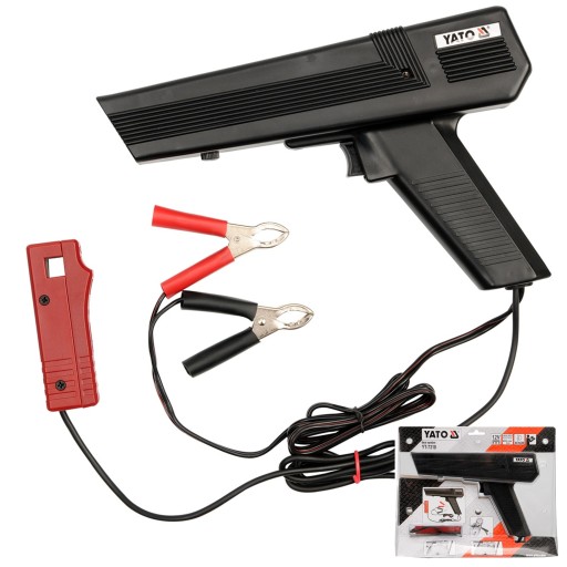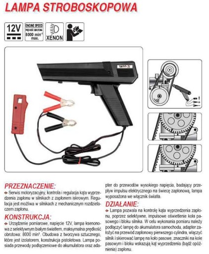 Lampa stroboskopowa profesjonalnej marki Yato. Przeznaczenie: serwis motoryzacyjny, kontrola i regulacja kąta wyprzedzenia zapłonu w silnikach z zapłonem iskrowym. Regulacja jest możliwa w silnikach z mechanicznym rozdzielaczem zapłonu.