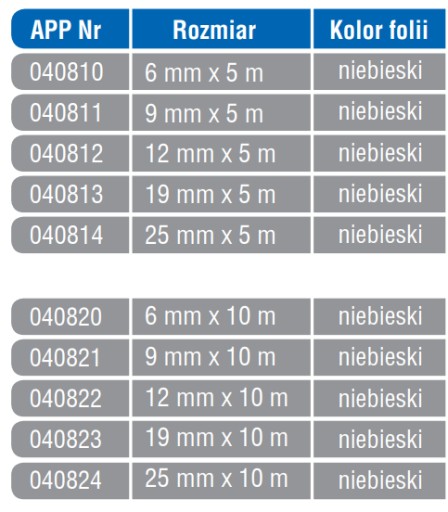 Podłoże Powierzchnia na którą nakładana jest taśma powinna być sucha dokładnie odpylona i odtłuszczona. Taśma jest przeznaczona do stosowania na powierzchniach z tw. sztucznych, metalowych, szklanych, ceramicznych i drewnianych oraz lakierach i emaliach.