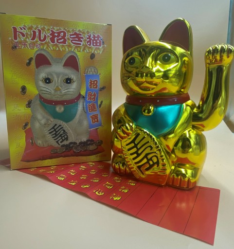 Lewa łapka Maneki-neko na szczęście jest ruchoma (zasilana 2x bateria AA). Kotek macha rączką w górę i w dół, zachęcając do wejścia osoby o czystym i dobrym sercu i intencjach.