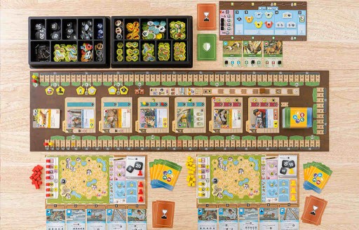 Wasze Zoo znajdują się w centralnych częściach plansz graczy i są złożone z heksów. To tam będziecie rozmieszczać swoje Budowle, np. Kioski albo Pawilony. Nie możecie budować na polach skał i wody, ale niektóre gatunki zwierząt będą wymagać Pawilonów w sąsiedztwie właśnie takich pól. Niektóry pola, ze specjalnym, żółtym heksem w środku, zapewnią wam bonusy, kiedy tylko je zakryjecie. Z kolei pola z ikoną karty będą dla was niedostępne, dopóki nie uda wam się udoskonalić waszych kart akcji.