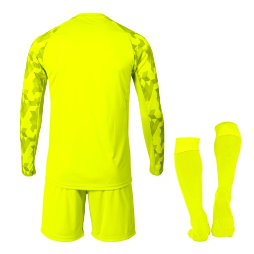 Strój dla bramkarza złożony z koszulki z długim rękawem, szortów i getrów. Koszulka z dekoltem wykończonym obszyciem. Na bokach i pod pachami użyto materiału siateczkowego Micro mesh, który sprzyja optymalizacji oddychalności i sprawia, że podczas uprawiania sportu ciało pozostaje suche. Spodenki elastyczne w pasie z regulowanym w obwodzie sznurkiem