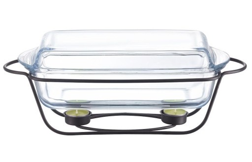 Naczynie żaroodporne o pojemności 3,9 l z linii Saule marki Ambition. Wspaniale sprawdzi się podczas przyjęć i rodzinnych spotkań. Do naczynia dołączony został stelaż na świeczki typu tealight, które mają za zadanie utrzymać danie w odpowiedniej temperaturze po wyjęciu z piekarnika. Konstrukcja stelaża umożliwia bezpieczne postawienie gorącego naczynia na stole.