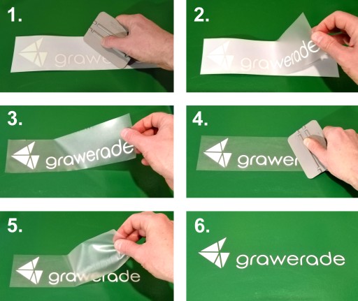 5. Po kilku minutach należy ostrożnie i powoli odklejać folię transferową, uważając aby naklejka została na powierzchni. Jeśli naklejka zostaje na folii transferowej należy użyć większego docisku.