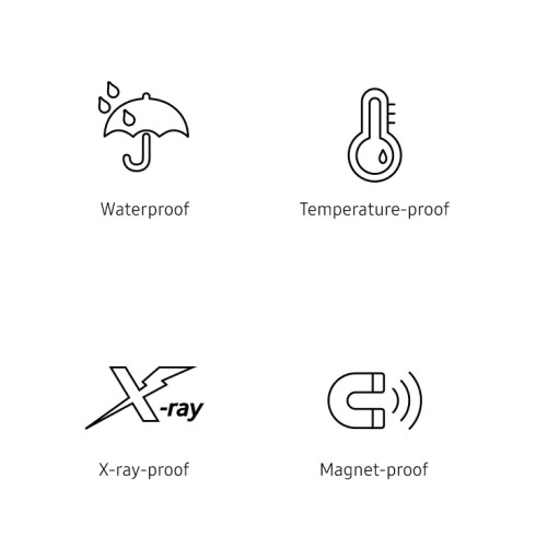 Twoje doświadczenia są niezastąpione – i bezpieczne. Karty EVO Plus chronione są w czwórnasób, wytrzymają więc do 72 h zanurzenia w morskiej wodzie¹, ekstremalne temperatury², lotniskowe rentgeny³ oraz pola magnetyczne równe temu, jakie wytwarza rezonans magnetyczny⁴.