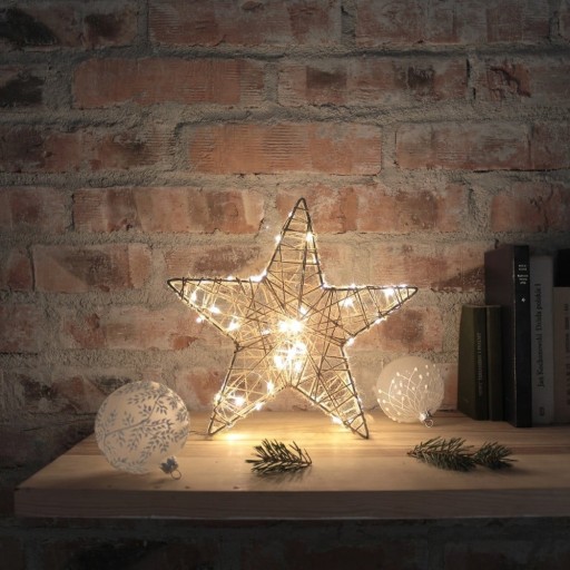 W zestawie znajdują się diody LED o ciepłej barwie, zasilane 3 bateriami AA, które należy umieścić w środku gwiazdy wraz z diodami led.