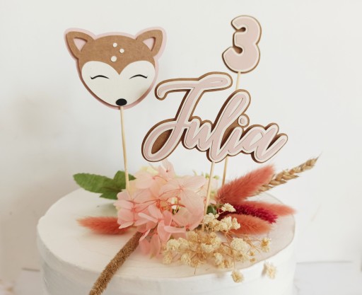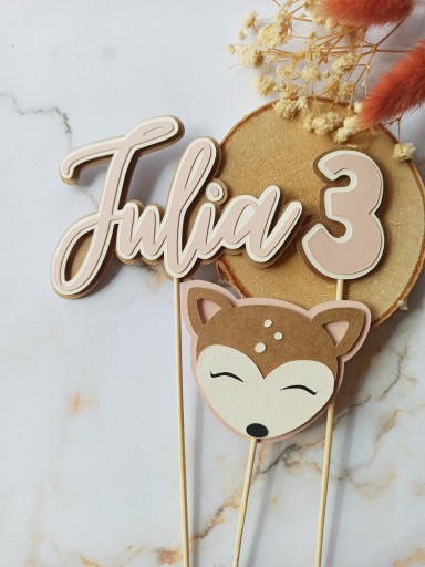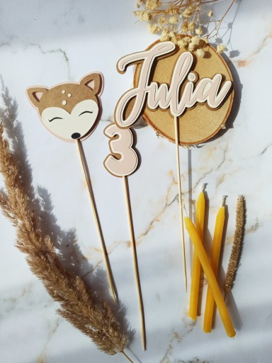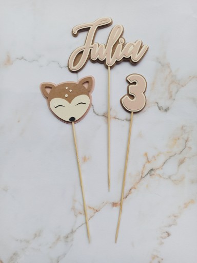 Zestaw topperów na leśne urodzinki - z sarenką, cyfrą i imieniem.