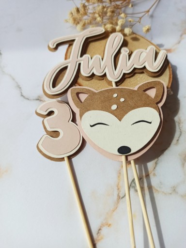 Ostateczne wymiary topperów z imieniem i cyferką zależą od wybranej treści. Głowa sarenki ma 5,5 cm wysokości (bez patyczka).