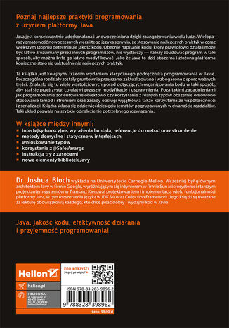 Ta książka jest kolejnym, trzecim wydaniem klasycznego podręcznika programowania w Javie. Poszczególne rozdziały zostały gruntownie przejrzane, zaktualizowane i wzbogacone o sporo ważnych treści. Znalazło się tu wiele wartościowych porad dotyczących organizowania kodu w taki sposób, aby stał się przejrzysty, co ułatwi przyszłe modyfikacje i usprawnienia. Poza takimi zagadnieniami, jak programowanie zorientowane obiektowo czy korzystanie z różnych typów, obszernie omówiono stosowanie lambd i strumieni, zasady obsługi wyjątków, korzystania ze współbieżności i serializacji. Książka składa się z dziewięćdziesięciu tematów pogrupowanych w dwanaście rozdziałów. Taki układ pozwala na szybkie odnalezienie potrzebnego rozwiązania.