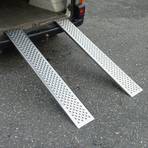 Nasze rampy będą świetnym rozwiązaniem przy ładowaniu motocykli, kosiarek, skuterów, maszyn budowlanych itp. Nośność 400 kg. Otwory na powierzchni szyn zapewnią dobrą przyczepność pojazdu - BRAK POŚLIZGÓW.