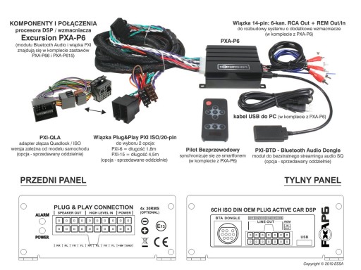 Excursion PXA-P6 - procesor DSP z wbudowanym wzmacniaczem mocy Excursion PXI-BTD (Bluetooth Dongle) - moduł Bluetooth Audio SQ do bezstratnej transmisji muzyki z przenośnych urządzeń Bluetooth Bezprzewodowy pilot zdalnego sterowania synchronizujący się z odtwarzaczem Bluetooth Wiązka przewodów sygnałowych RCA Out + REM In/Out do złącza 14-pinowego - długość 0,5m Wiązka przewodów PXI-15 o długości 4,5m - wej./wyj. ISO DIN Plug & Play (zasilanie, głośniki) do złącza 20-pinowego Kabel USB do komputera PC Instrukcja montażu i obsługi UWAGA! - Bezpłatne oprogramowanie do konfiguracji procesora i strojenia systemu audio dostępne jest z zakładce DO POBRANIA.