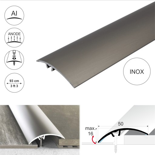 Doskonałej jakości aluminiowa listwa progowa w kolorze inox. Idealna do łączenia podłóg drewnianych, laminowanych, dywanowych, winylowych lub płytek, które są na tym samym lub różnym poziomie (do max 16 mm). Dwie silikonowe uszczelki tworzą barierę dla wilgoci i zanieczyszczeń wokół listwy. Zakrywa szczeliny miedzy podłogami.