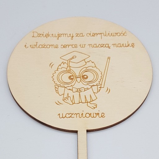 Topper na dzień nauczyciela to życzenia i dekoracja prezentu, najczęściej kwiatów, skondensowane w drewnianej, grawerowanej ozdobie. Sami możecie ustalić tekst, który znajdzie się na topperze.