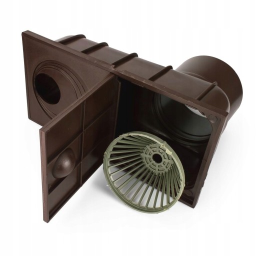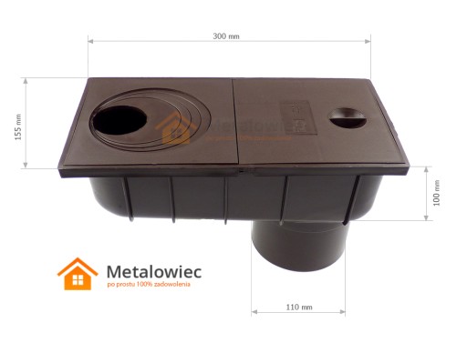 Pokrywa rynnowa posiada wytłoczenia do wycięcia dla rur spustowych o średnicy fi 50; fi 80; fi 90;fi 100; fi 110mm. Pokrywa pełna umożliwia rewizję i czyszczenie z zanieczyszczeń. Korpus studzienki podrynnowej posiada odpływ pionowy dla rur kanalizacyjnych o średnicy fi 110 mm.