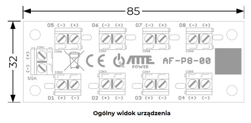Moduł bezpiecznikowy pozwala na rozdzielenie zasilania do 8 odbiorników. Każde wyjście zasilania posiada niezależne zabezpieczenie przeciążeniowe i przeciwzwarciowe a obecność napięcia na poszczególnych wyjściach sygnalizuje czerwona dioda LED.