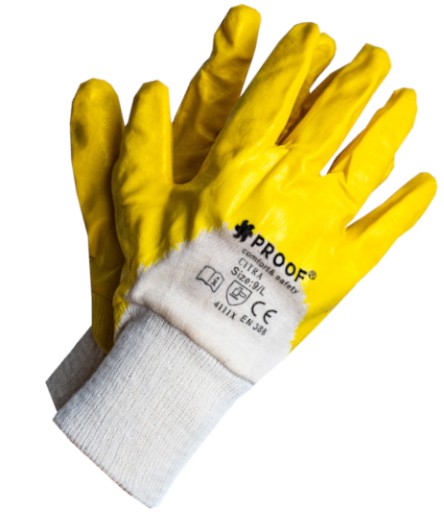 Rękawice robocze wykonane z bawełny powleczone częściowo żółtym nitrylem.