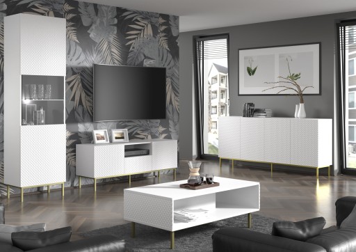 Kolekcja Ravenna to propozycja dla osób, które cenią stylowe i ekskluzywne meble. Reprezentują one włoski styl, nadając wnętrzu eleganckiego wykończenia z klasą. Praktyczne bryły są ustawione na metalowych szpilkach, które są trwałe i zapewniają stabilność. Taka konstrukcja wpisuje się w najnowsze trendy oraz stanowi dodatkowy element dekoracyjny. Bezuchwytowe fronty dodają nowoczesnego designu, a system "push to open'' dba o wygodę codziennego użytkowania. Na szczególną uwagę zasługują także frezowane fronty w połysku, które błyszczą niczym prawdziwy diament. Dekor, nawiązujący kształtem do szlachetnego kamienia, stanowi nietuzinkowy akcent, który przyciąga wzrok.