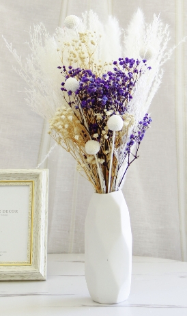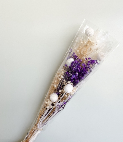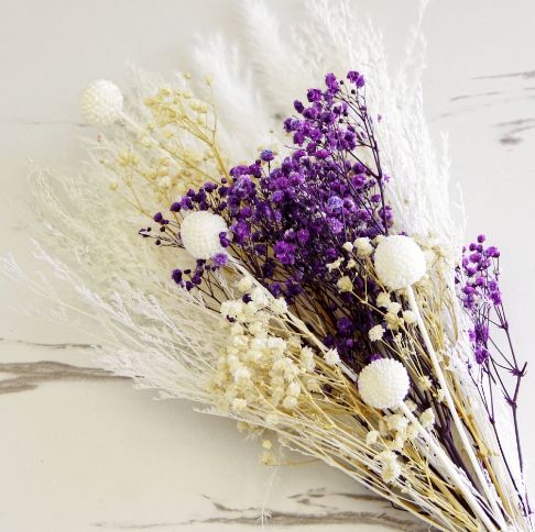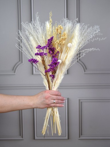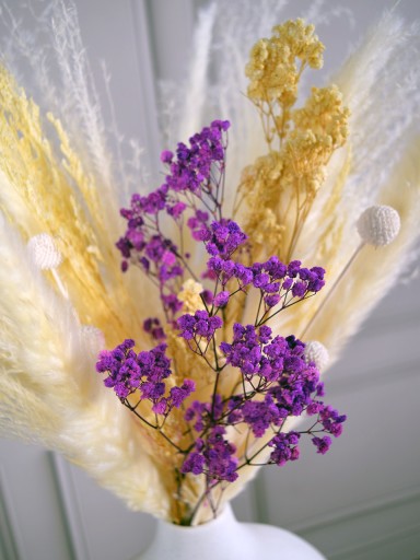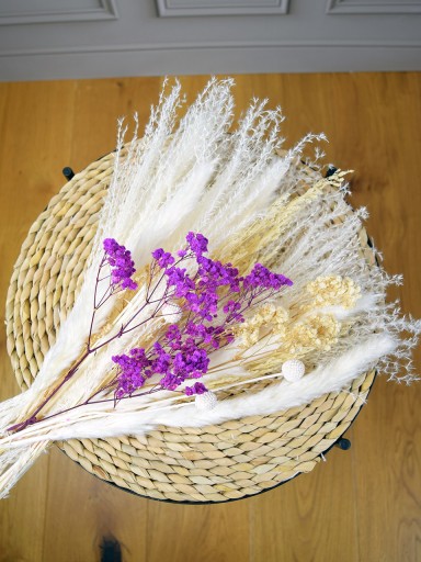 Na tej aukcji kupujesz jeden gotowy bukiet składający się z dwóch rodzajów białej trawy pampasowej, gipsówki fioletowej, gipsówki kremowej, gałązek pampasowych i suszonych kuleczek