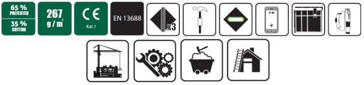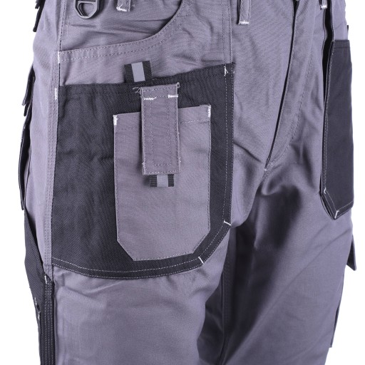 Pojemne kieszenie, o sprecyzowanym zastosowaniu, w tym uniwersalna miechowa, na telefon, długopis, miarę i uchwyt na młotek, wzmocnione materiałem OXFORD 300D