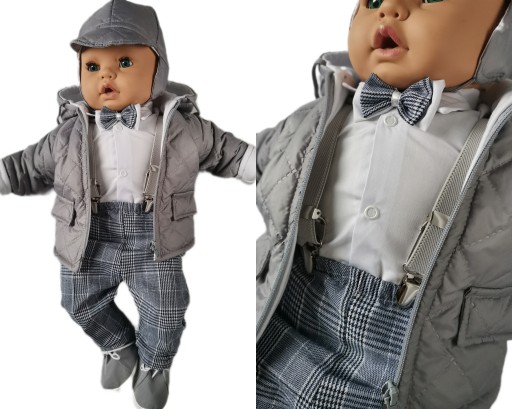 Bardzo bogaty zestaw do chrztu dla chłopca. Modny, utrzymany w modnych kolorach bieli i granatu lub delikatnej szarości. Elegancki, a zarazem z ciekawym elementem w postaci szelek do spodni w różnych kolorach do wyboru.