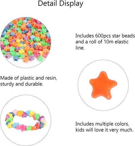 Zestaw wielokolorowych koralików 600 sztuk koralików w ksztacie gwiazdy zawiera wiele kolorów do wyboru dostarczane z rolk z 10 m rozcigliwego krysztau. Mona przyci na dan dugo aby wytworzy rcznie wykonane produkty. Rkodzieo dla dzieci Rodzice mog uywa tych koralików do majsterkowania z dziemi wiczy koordynacj dzieci midzy dońmi i oczami oraz kontrolowa kolor i ilo poprawi praktyczne umiejtnoci i interakcj rodziców z dzieckiem. Szerokie zastosowanie Ten zestaw koralików DIY jest odpowiedni dla maych dzieci które chtnie wytwarzaj rzemioso artystyczne. Uyj tych pere aby stworzy naszyjniki przyjani bransoletki kolczyki opaski na czoo breloczki do kluczy i inne ozdoby dla przyjació. Wzornictwo premium pery gwiazdowe z tworzywa sztucznego i ywicy maj róne kolory i wygldaj bardzo modnie. Rozcigliwa krysztaowa linia jest wytrzymaa i trwaa ma du si cignc i nie pka. Popularne prezenty dla dzieci które lubi rzemioso artystyczne nasze pery s idealnym prezentem do majsterkowania. Jest to idealny wybór dla tych którzy chc zrobi prezenty swojej córki wnuczki siostrzenicy i uczniom.