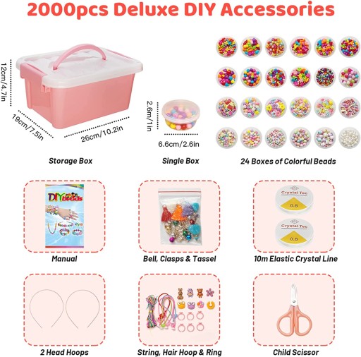 Zestaw biuterii 2000 sztuk kolorowych koralików dzwonków i innych akcesoriów do biuterii DIY. Wszystkie pery s podzielone na 24 zestawy do majsterkowania dostarczane s równie z duym pudekiem do przechowywania. Umoliwiaj dzieciom tworzenie rónych bransoletek naszyjników piercionków i opasek do wosów poprawienie ich kreatywnoci i praktycznych umiejtnoci. Biuteria dla dziewczt wykonana z wysokiej jakoci materiau i moe by uywana na klasach szkolnych na imprezach dla dziewczynek itd. Wspaniay prezent dla dzieci w wieku od 4 do 5 6 7 8 lat dziewczynki bd si rozryway przez wiele godzin.