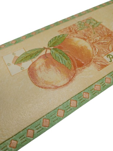 Wzór: Kuchenny w tonacji żółto-zielono-orzechowej. Zielono-seledynowe winogrono z gałązką i liściem, zielono-żółta gruszka z gałązką i liśćmi, jabłka z gałązką i liśćmi w kolorze orzech średni-żółty. Prostokąty orzechowe z liściastymi deseniami, zielone nazwy łacińskie. Tło stonowane, żółte. Na obu krawędziach szlaczek - orzechowe rąby na zielonym tle. Pasek w pełni zmywalny.