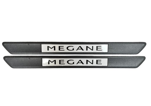 Komplet listew z logo Mégane na przód. Wykonane z trwałego tworzywa sztucznego.