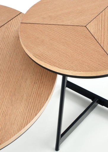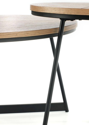 Stalowa podstawa lakierowana na czarno, blat wykonany z MDF-u z okleiną w kolorze naturalnego dębu, ustawiony przy kanapie bądź fotelu idealnie wkomponuje się w wystrój każdego salonu