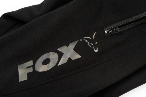 - Czarne joggery z pionowym logo we wzorze Fox Camo