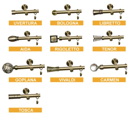Poniżej warianty kolorystyczne karniszy oraz rodzaje zakończeń do wyboru.