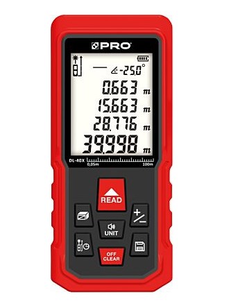 Dalmierz laserowy renomowanej firmy PRO posiada funkcje pomiaru pośredniego (wzbogaconą o możliwość obliczania sumy i różnicy), pomiaru ciągłego i dynamicznego. Umożliwia pracę w zakresie od 0,05 m do 40 m. Doskonały do pracy na zewnątrz dzięki wbudowanemu podświetleniu ekran jest czytelny nawet kiedy jest bardzo słonecznie. Całość została zamknięta w solidnej obudowie o klasie szczelności IP54. Posiada antypoślizgowe przyciski.
