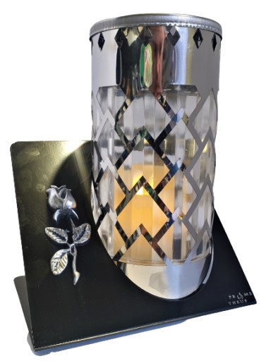 Piękny znicz całoroczny w kształcie tuby z różyczką.