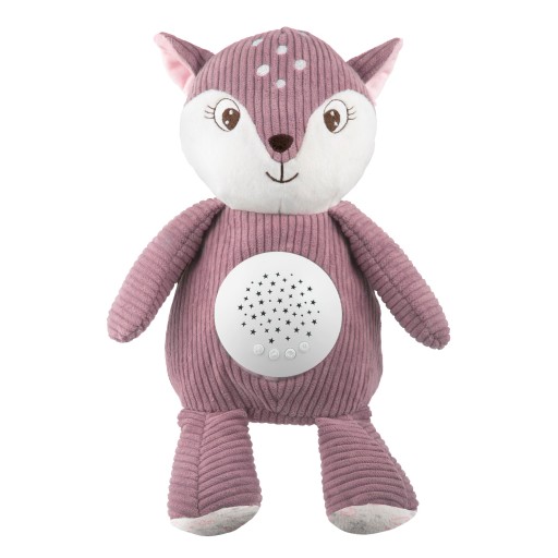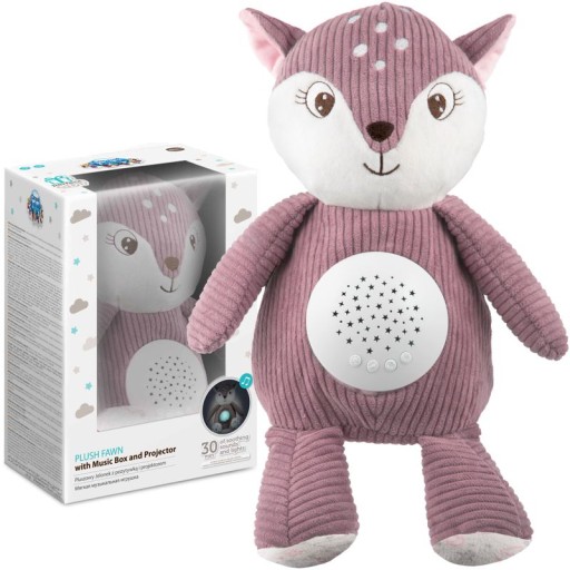 Miękka pluszowa maskotka z ukrytym w brzuszku mechanizmem wyświetlającym kolorowe gwiazdki i odtwarzającym relaksujące melodie uspokoi Maluszka i ułatwi mu zasypianie. Przytulanka działa w 3 trybach pracy. Może emitować z brzuszka melodie i projekcje świetlne, same melodie lub jedynie delikatne światła, pełniąc tym samym funkcję nocnej lampki. Do wyboru 12 spokojnych melodii w tym delikatne dźwięki natury, śpiew ptaków i bicie serca oraz możliwość ustawienia 5 poziomów głośności, w zależności od preferencji Maluszka. Po 30 minutach zabawka automatycznie się wyłączy. Idealny prezent od chwili narodzin. Dostępny w 2 wersjach kolorystycznych, dla chłopca i dziewczynki. Łatwo utrzymasz Jelonka w czystości, po usunięciu z brzuszka mechanizmu możesz uprać maskotkę ręcznie.