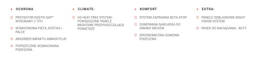 - Ochraniacze: protektor kostki SAP™ wykonany z TPU, wzmocniona pięta, kostka i palce; absorber impaktu armor plus; poprzecznie wzmacniana podeszwa