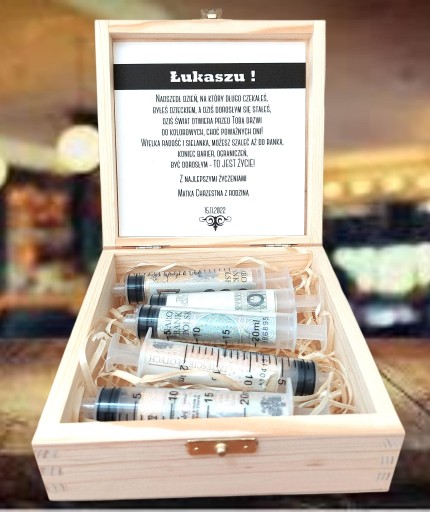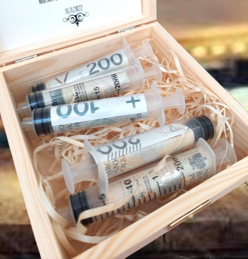 Drewniana jasno sosnowa skrzynka z 5 strzykawkami do których zwijamy i wkładamy określoną kwotę. Wewnątrz życzenia - do wyboru 35 wierszyków.