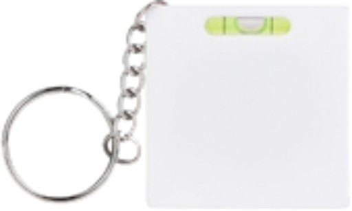 Brelok do kluczy w białej plastikowej obudowie posiada miarę 1m oraz poziomicę.