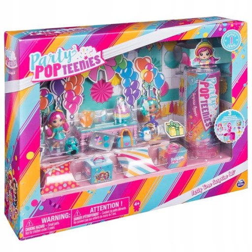 Zabawa dopiero się zaczyna: przyjdź świętować z imprezowym zestawem! Wystrzałową nispodziankę po prostu przekręć i uwolni chmurę kolorowe konfetti i nową laleczkę Party Popteenie! Dwie dodatkowe lalkeczki i urocze zwierzaki w tym zestawie rozkręcą imprezę! Zbieraj tęczowe laleczki i odkrywaj je w chmurze confetti. Rozpakuj mini prezenty, aby zobaczyć jakie imprezowe dodatki lub smakołyki czekają dla twoich laleczek! Wykorzystaj urocze mebelki i akcesoria, aby przygotować tą wyjątkową imprezę. Możesz zaprojektować finalny wygląd imprezy dzięki dołączonym naklejkom. Jaki temat imprezy wybierzesz?